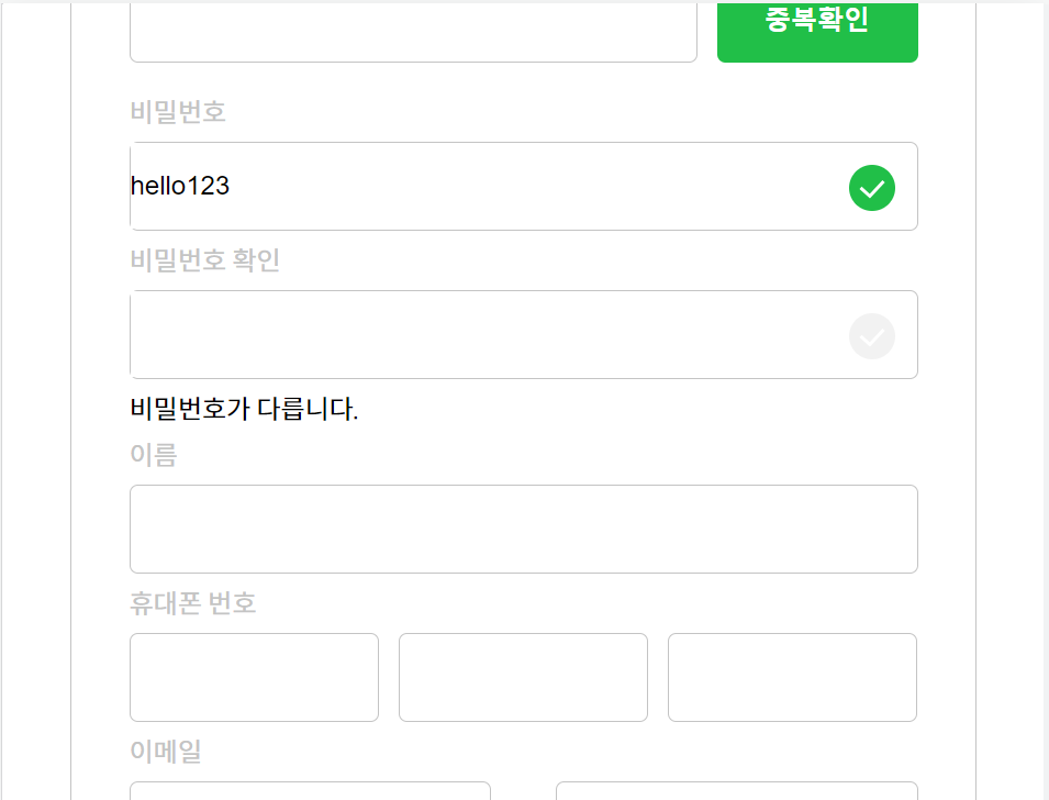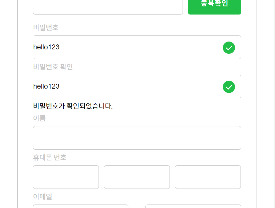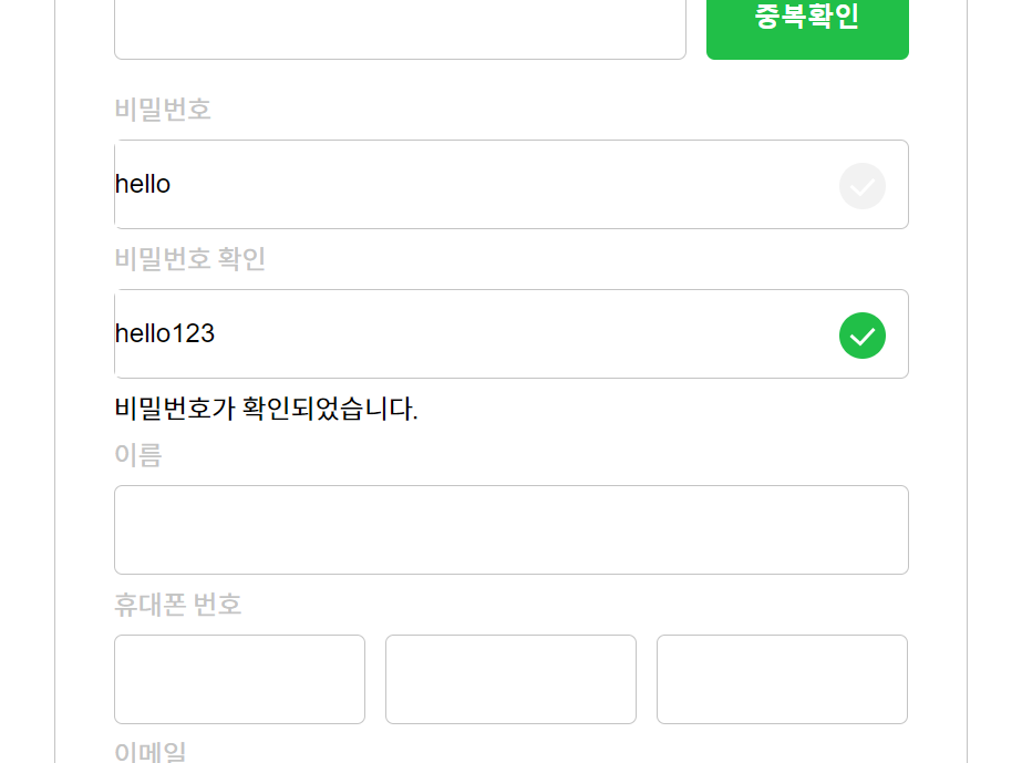 그리고 여기서는 비밀번호와 동일하게 입력하여서 '비밀번호가 확인되었습니다.' 문구와 함께 체크표시가 나타난다.