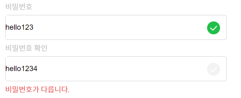 비밀번호 확인란에서 비밀번호와 같은지 여부가 제대로 반영이 되지 않았다.