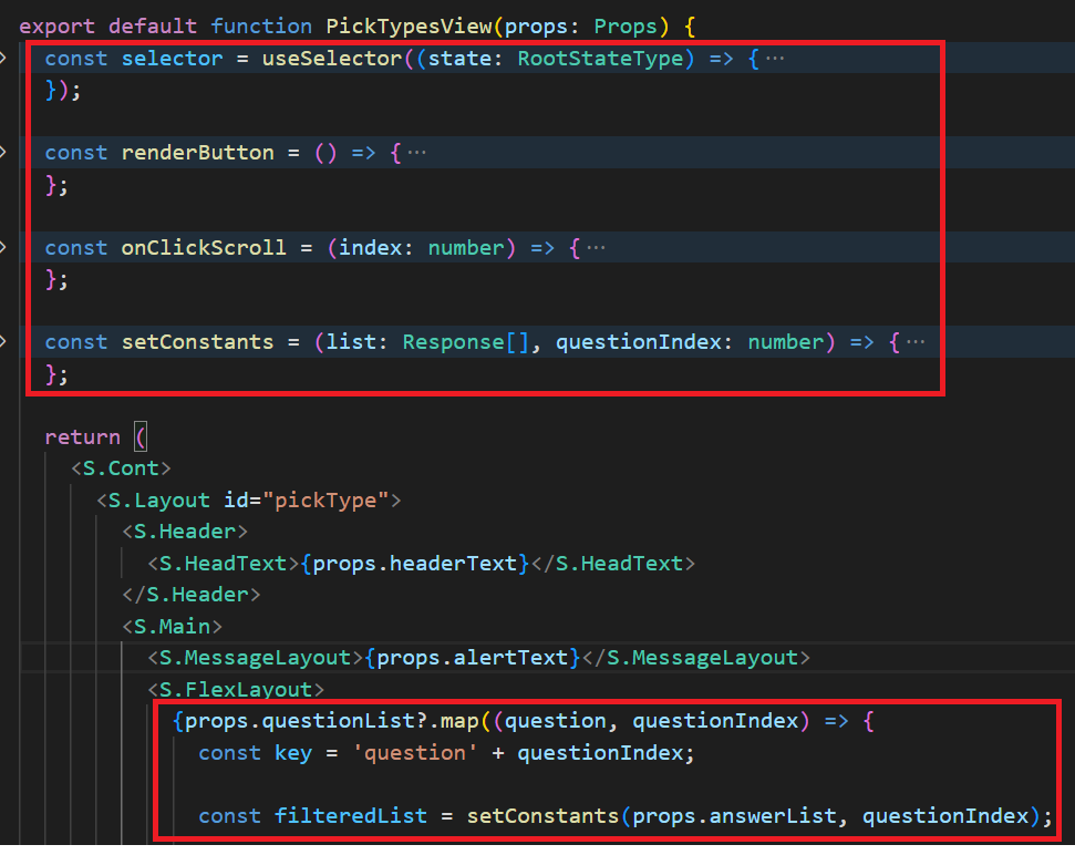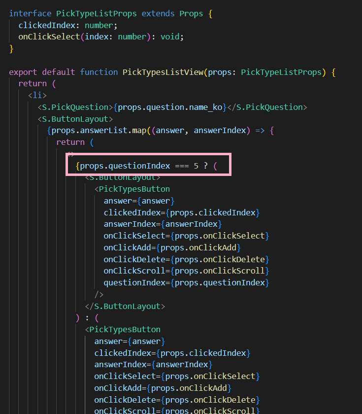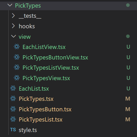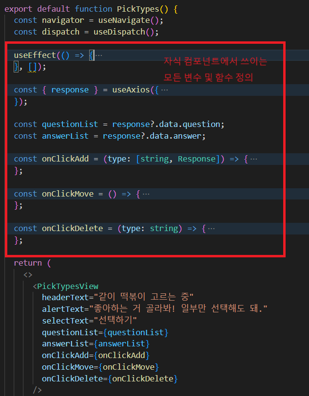 VAC 패턴이랍시고 PickTypesView.tsx로 만들어놓고 비즈니스 로직이 포함된 것을 볼 수 있다. 급하게 로직을 추가하느라고 그렇게 되었다..