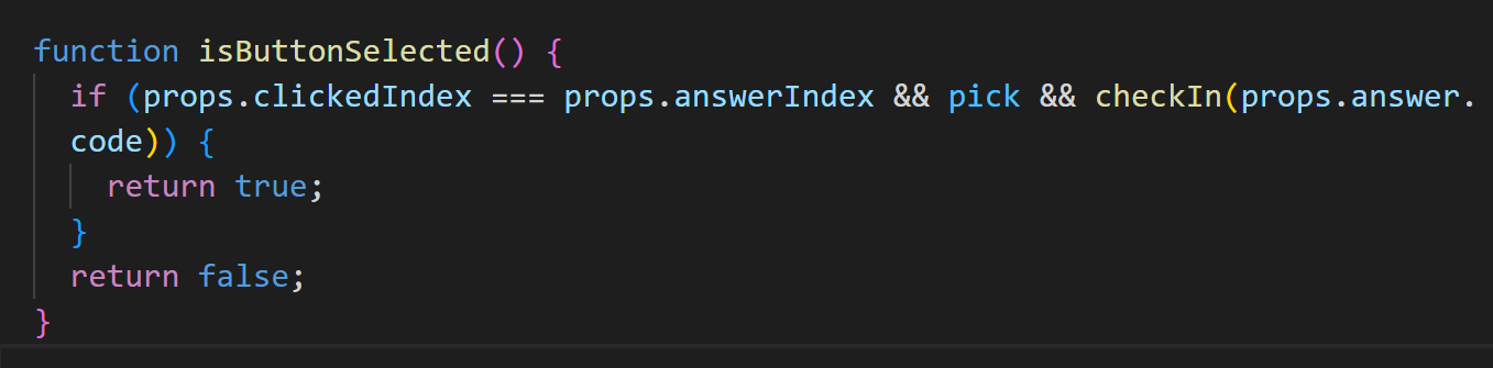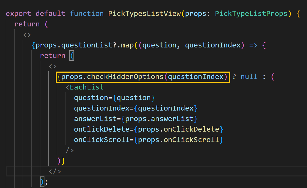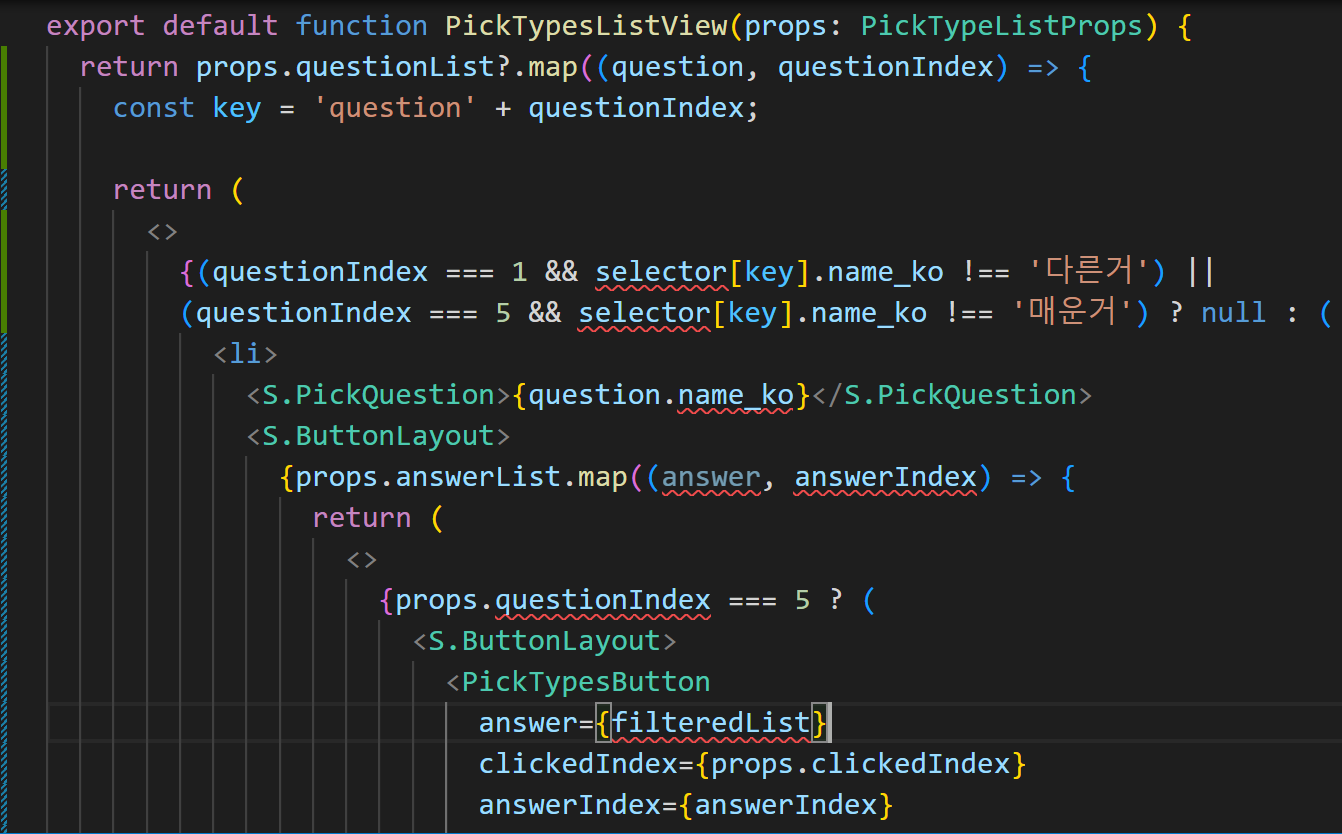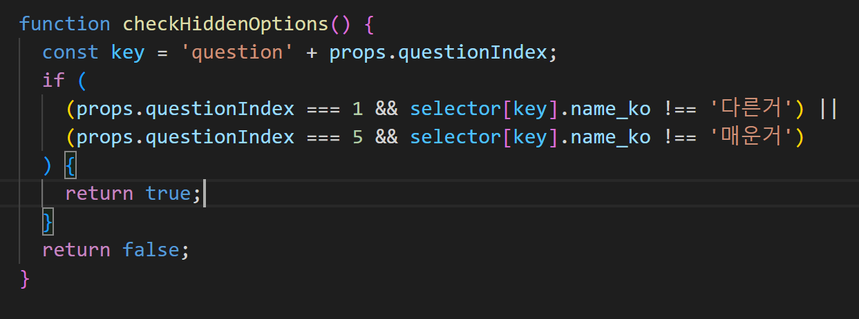 무슨 로직이냐면, 넘겨받은 questionIndex(질문 번호)에 대한 선택이 '다른거' 이거나 '매운거' 라면 true를 반환하는 것이다. 리턴값이 true면 숨겨둔 질문을 보여준다.