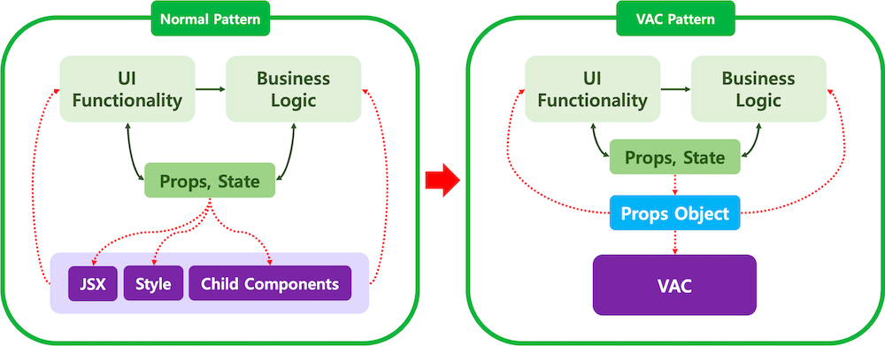해당 사진과 같이, 기존에는 UI와 비즈니스 로직에 대한 상태(state)를 props와 다양한 컴포넌트에서 가졌다면, VAC 패턴은 Business Logic 컴포넌트에서 props에게 모든 상태를 전달하도록 위임하여 로직을 분리하는 방법이다.