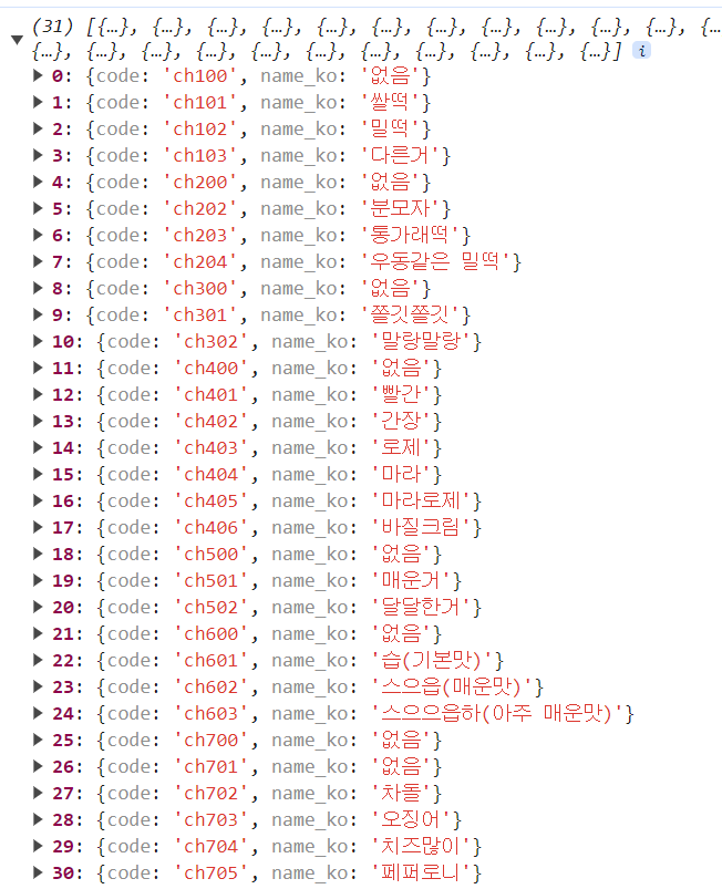 answerList는 이렇게 배열안에 모든 answer가 담겨있는 형태이고, 각 객체의 code 값 ch뒤에 오는 첫번째 숫자가 질문에 맞는 값이다.