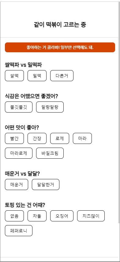 내가 만든 UI는 조건부 렌더링이다. 1번 질문에서 '다른거' 를 선택했을 때만 2번 질문이 보이고 5번 질문에서 '매운거'를 선택했을 때만 6번 질문이 보인다.
