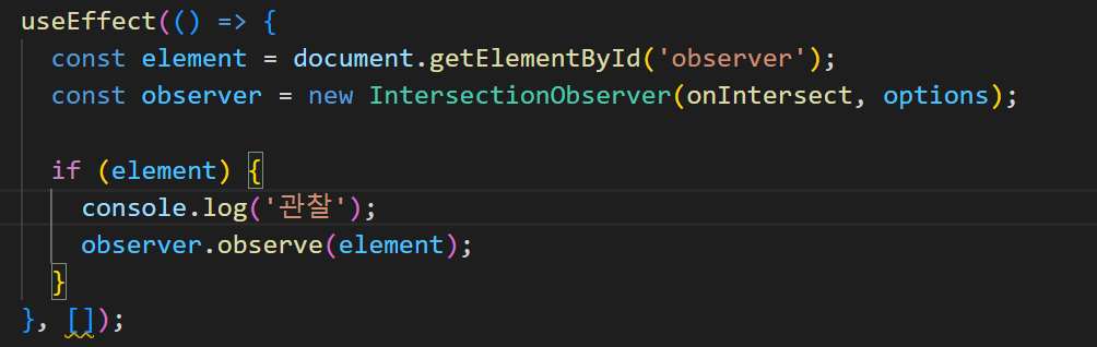 new IntersectionObserver()를 통해 생성한 인스턴스로 관찰자를 초기화하고 관찰할 대상을 정하였다.