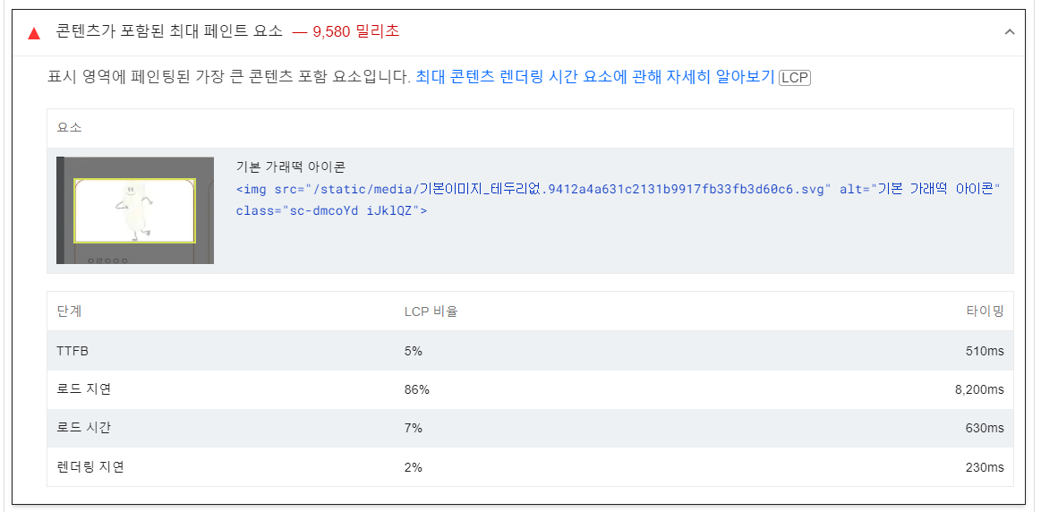 보니까 LCP(콘텐츠가 포함된 최대 페인트) 점수가 0점이었다. 그러니까 렌더링이 가장 오래 걸리는 요소가 렌더링 되는 시간이 권장 시간보다 오래 걸리는 것이 주요 원인이었다.