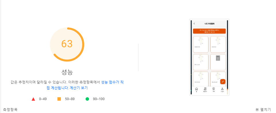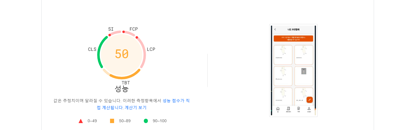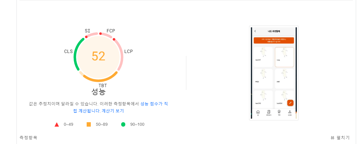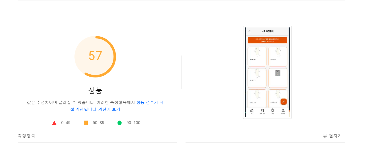 주요 페이지인 후기 페이지를 먼저 측정해보았다. 성능이 50점 미만이면 '나쁨'인데 간신히 50점에 걸쳐 '개선' 단계로 된 상황이었다. 그래도 데스크탑 점수는 80점대인데 모바일이 특히 성능이 낮았다.