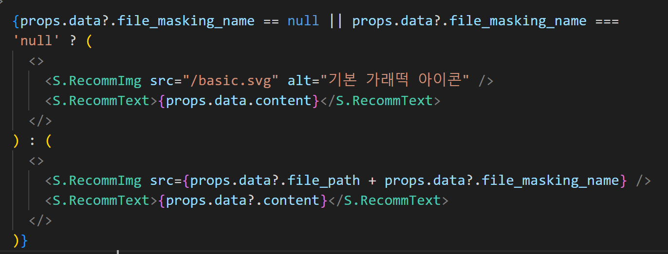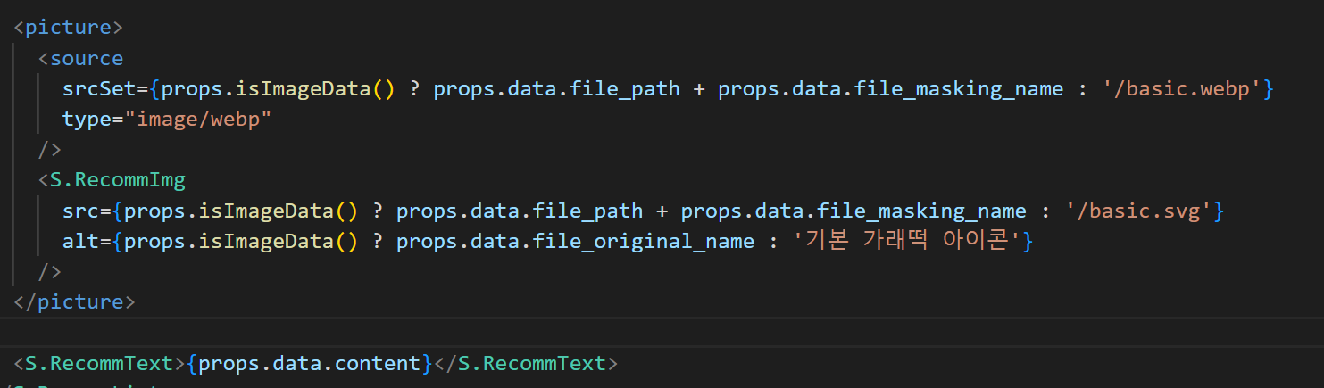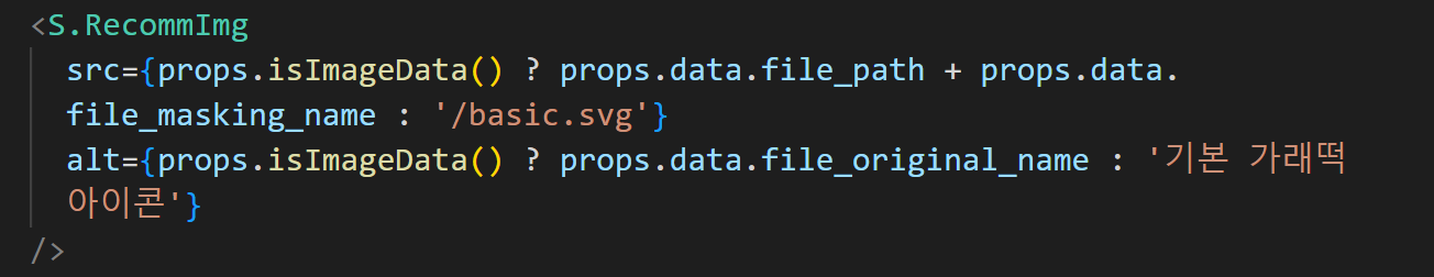태그를 동적으로 하지 않고 src속성과 alt속성 내의 string 을 동적으로 제어하기로 했다. 하위 컴포넌트에서 해당 함수를 실행했을 때 반환값에 따라 불러온 이미지를 쓸지 기본 이미지를 쓸지가 결정된다.