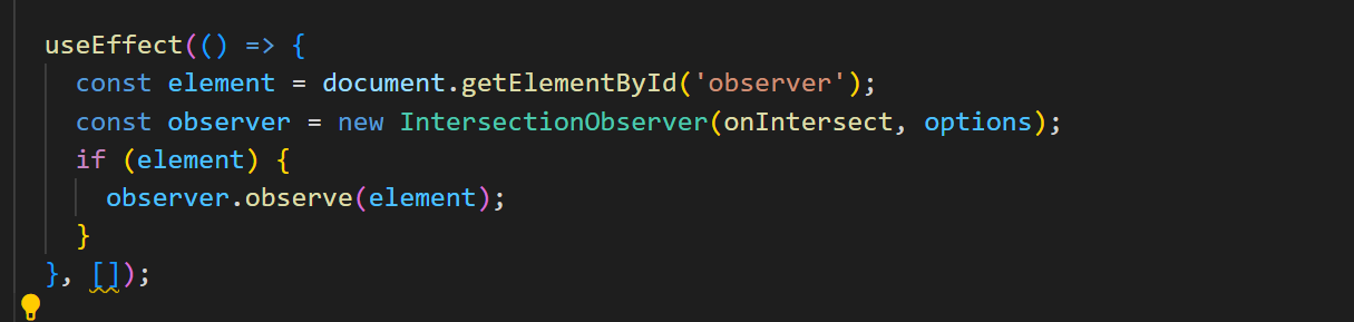new IntersectionObserver()를 통해 생성한 인스턴스로 관찰자를 초기화하고 관찰할 대상을 정하였다.