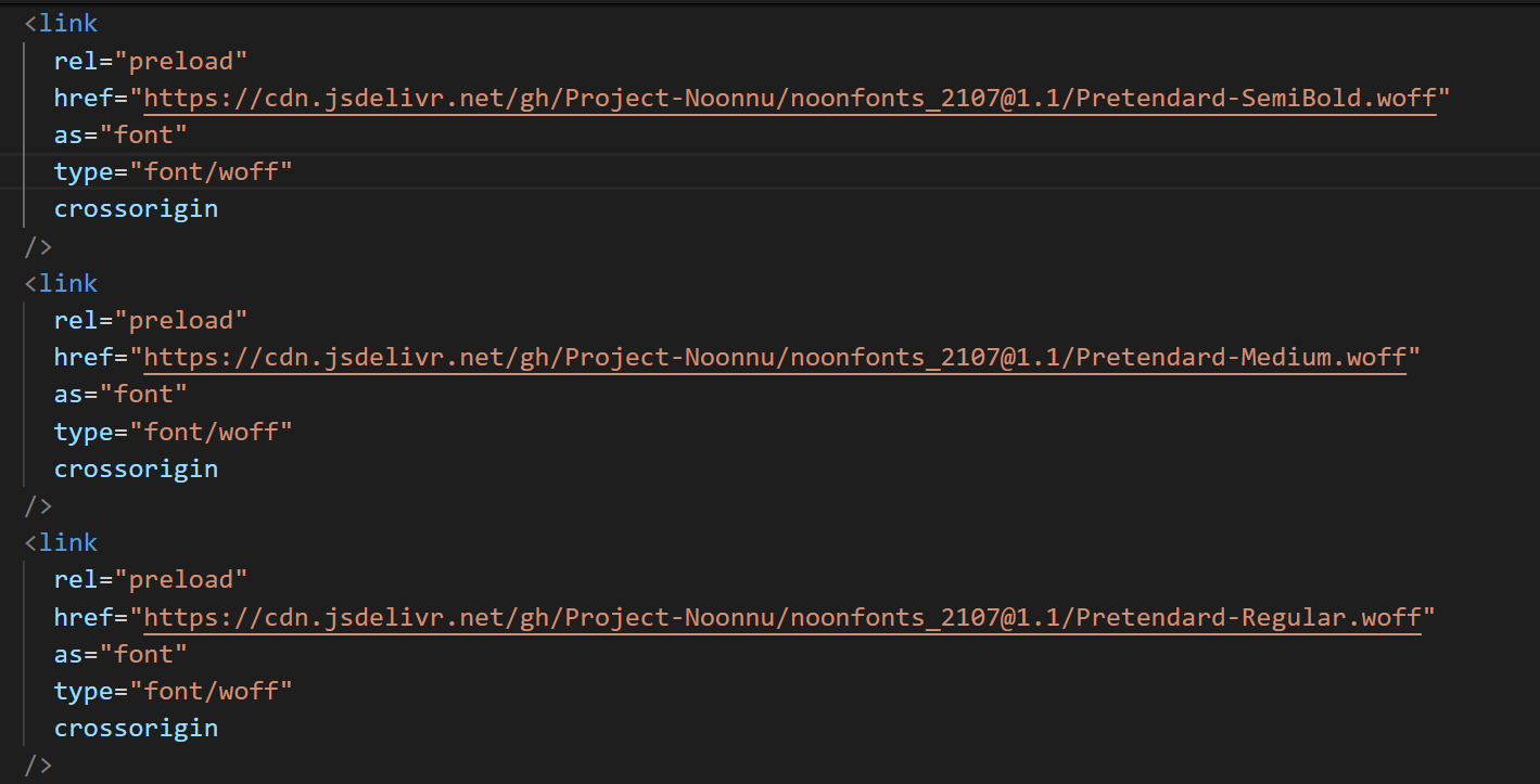 폰트 preload로 성능을 올렸다는 글도 봐서 폰트도 preload 하였다.