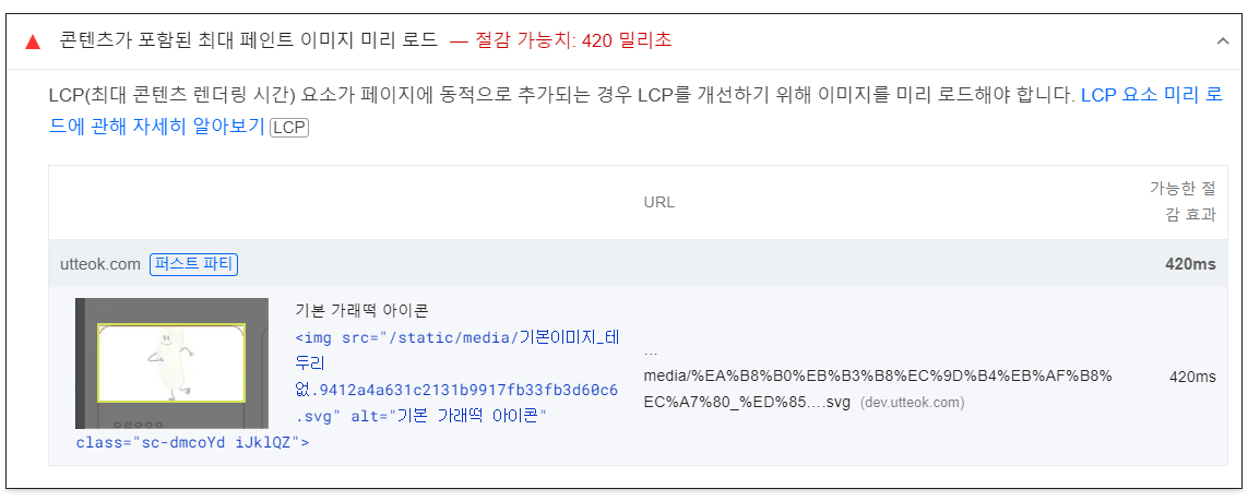 LCP 최적화 권장사항을 확인해보았는데 '콘텐츠가 포함된 최대 페인트 이미지 미리 로드' 라는 문구가 눈에 띄었다.