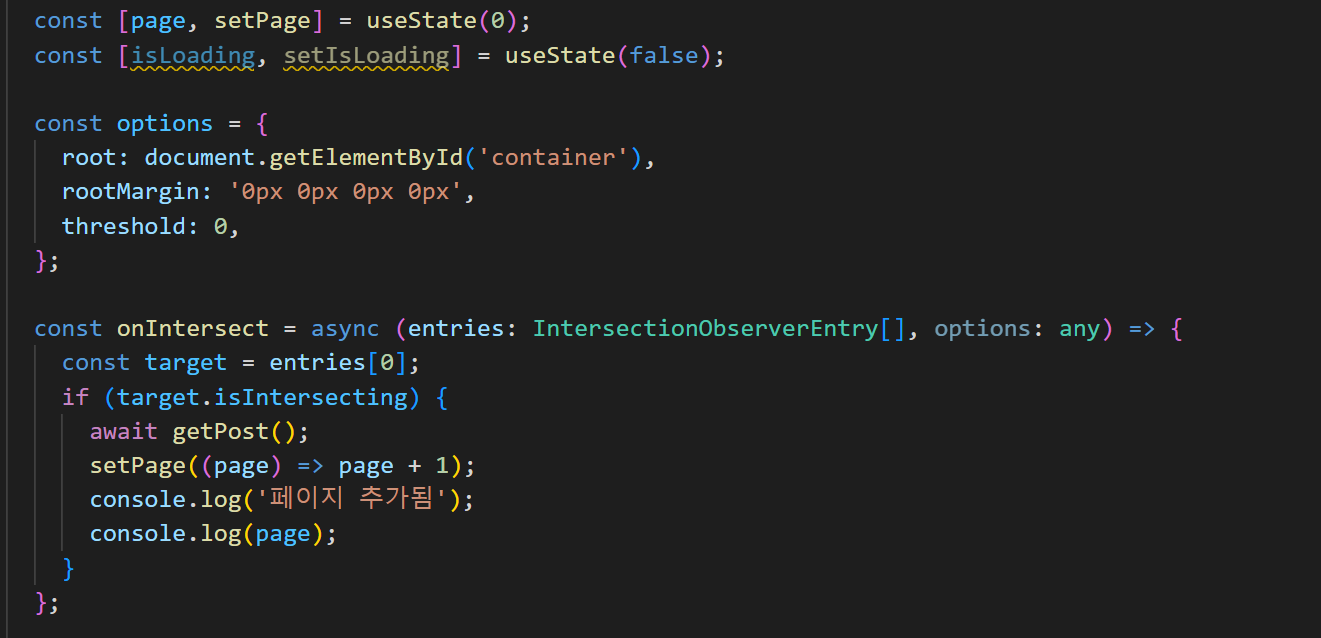 여기서 callback 함수는 설정한 뷰포트와 요소가 교차할 때, 즉 사용자 화면에 설정한 요소가 보이지 않을 때 실행할 함수이다. 그러니까 이 함수를 api 호출하는 함수로 지정하면 스크롤을 통해 요소가 교차할 때마다 api를 호출할 수 있다.