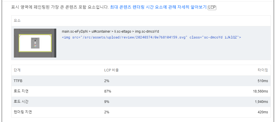 LCP 비율에서 로드 지연이 87프로로 대부분의 비율을 차지하고 있었다. 이상적인 비율과 완전히 다르다.
