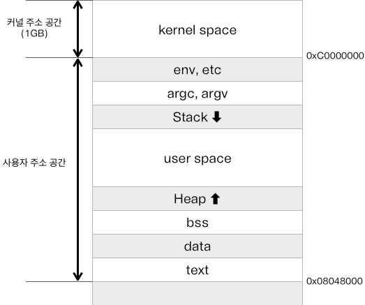 - 커널 공간은 모든 사용자 프로세스에 의해 공유 (프로세스나 스레드가 스택이나 힙을 소유 )