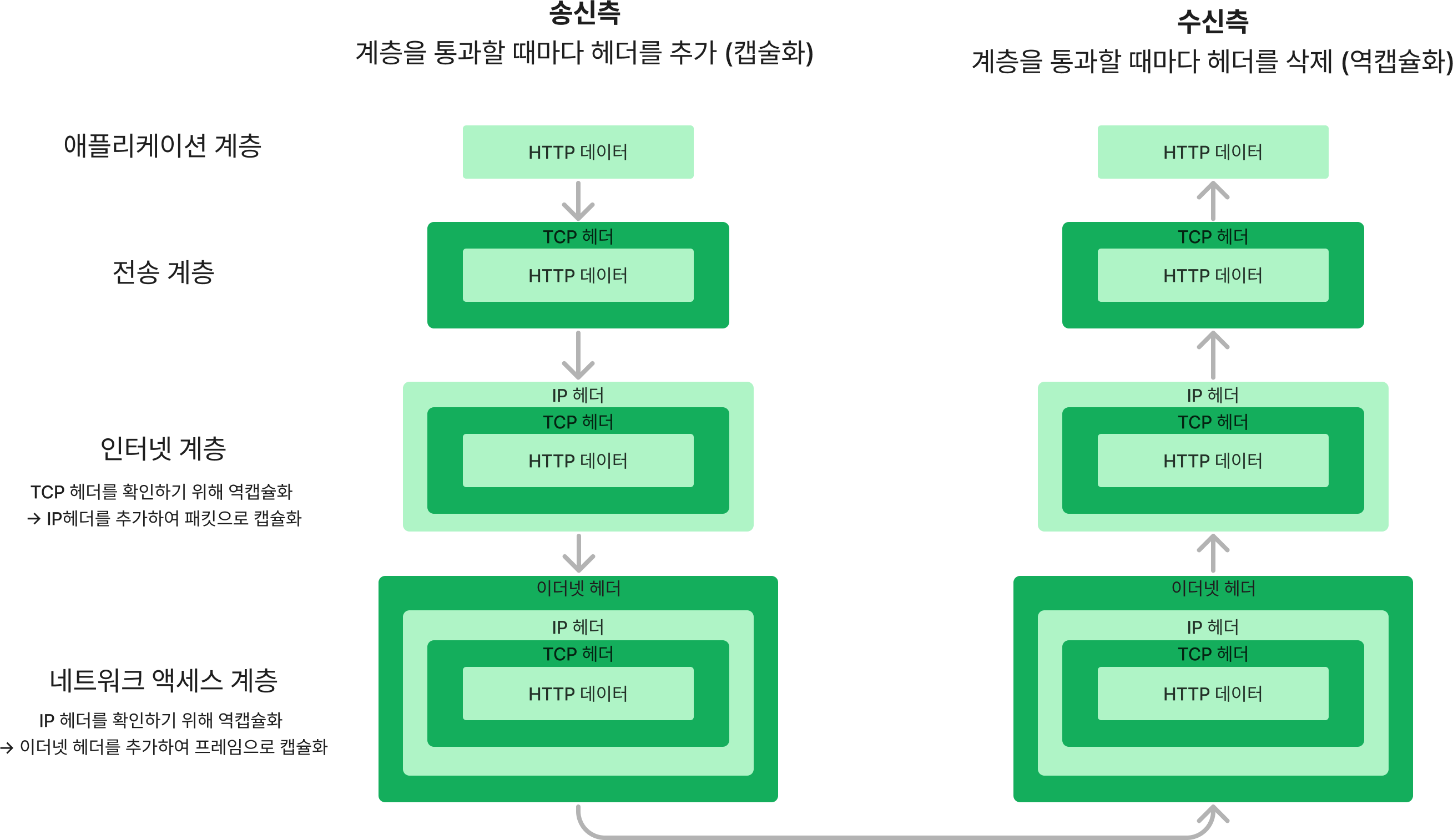 데이터는 각 계층을 지나면서 캡슐화되고, 도착지에서 역캡슐화된다.